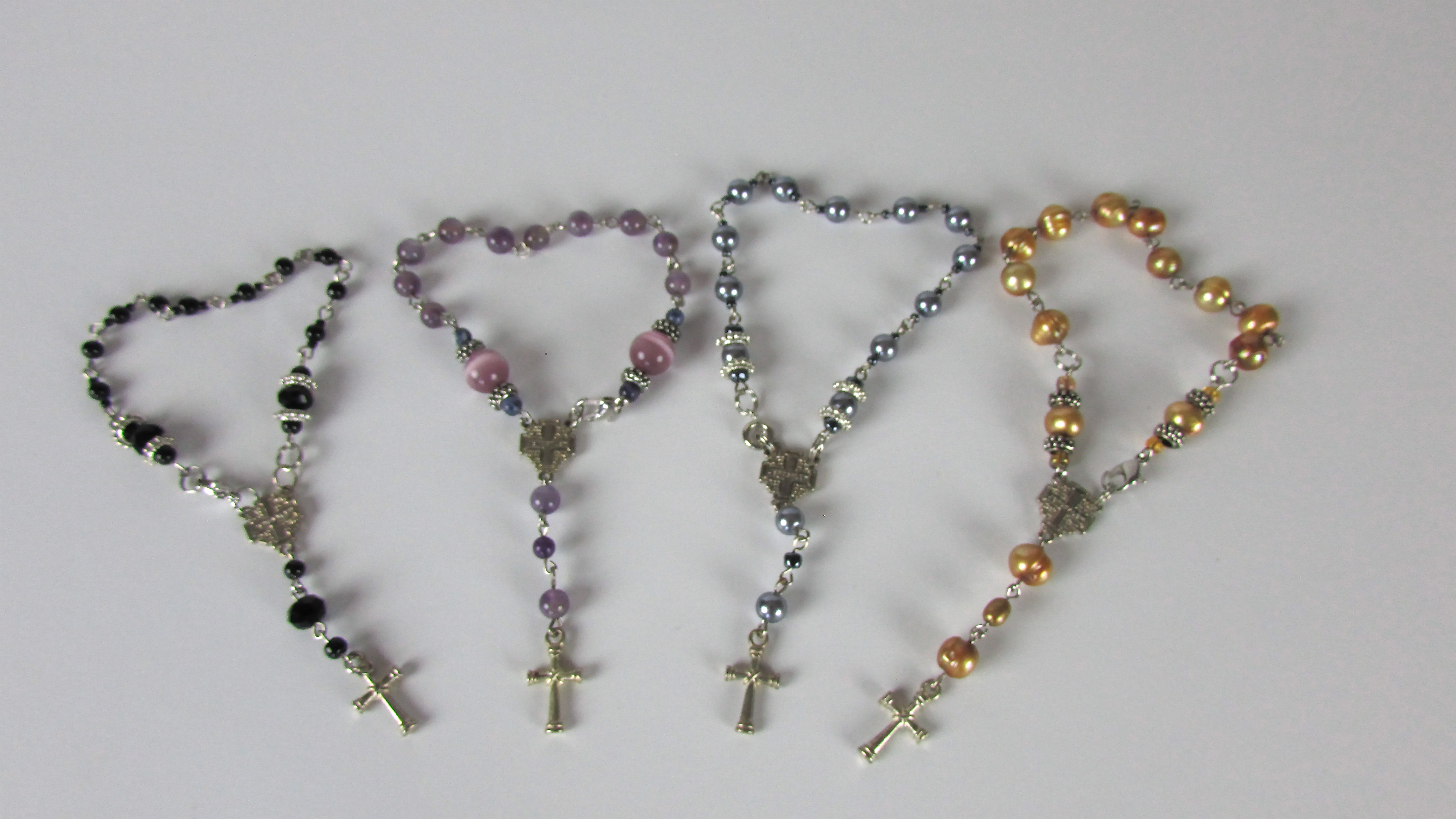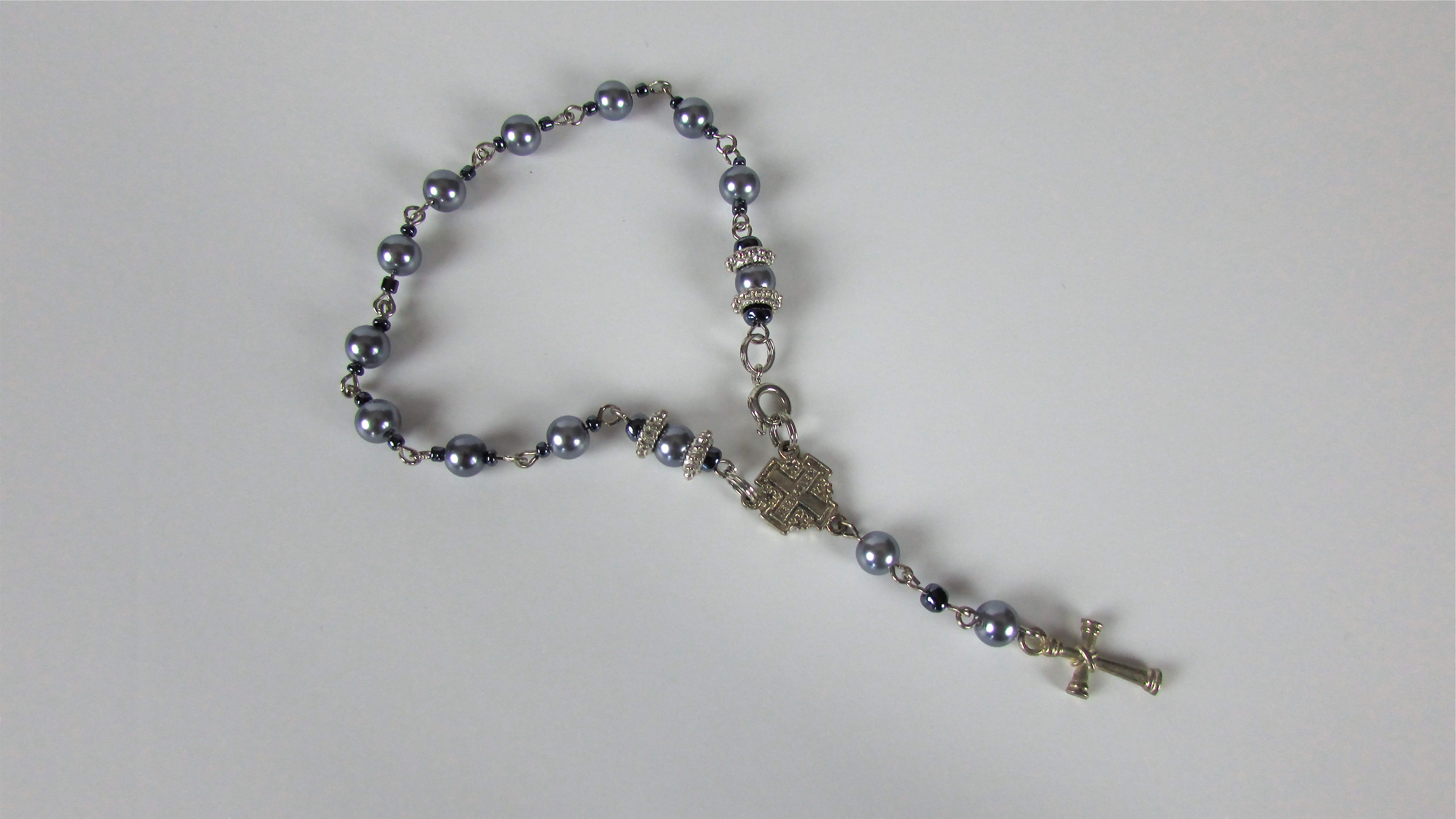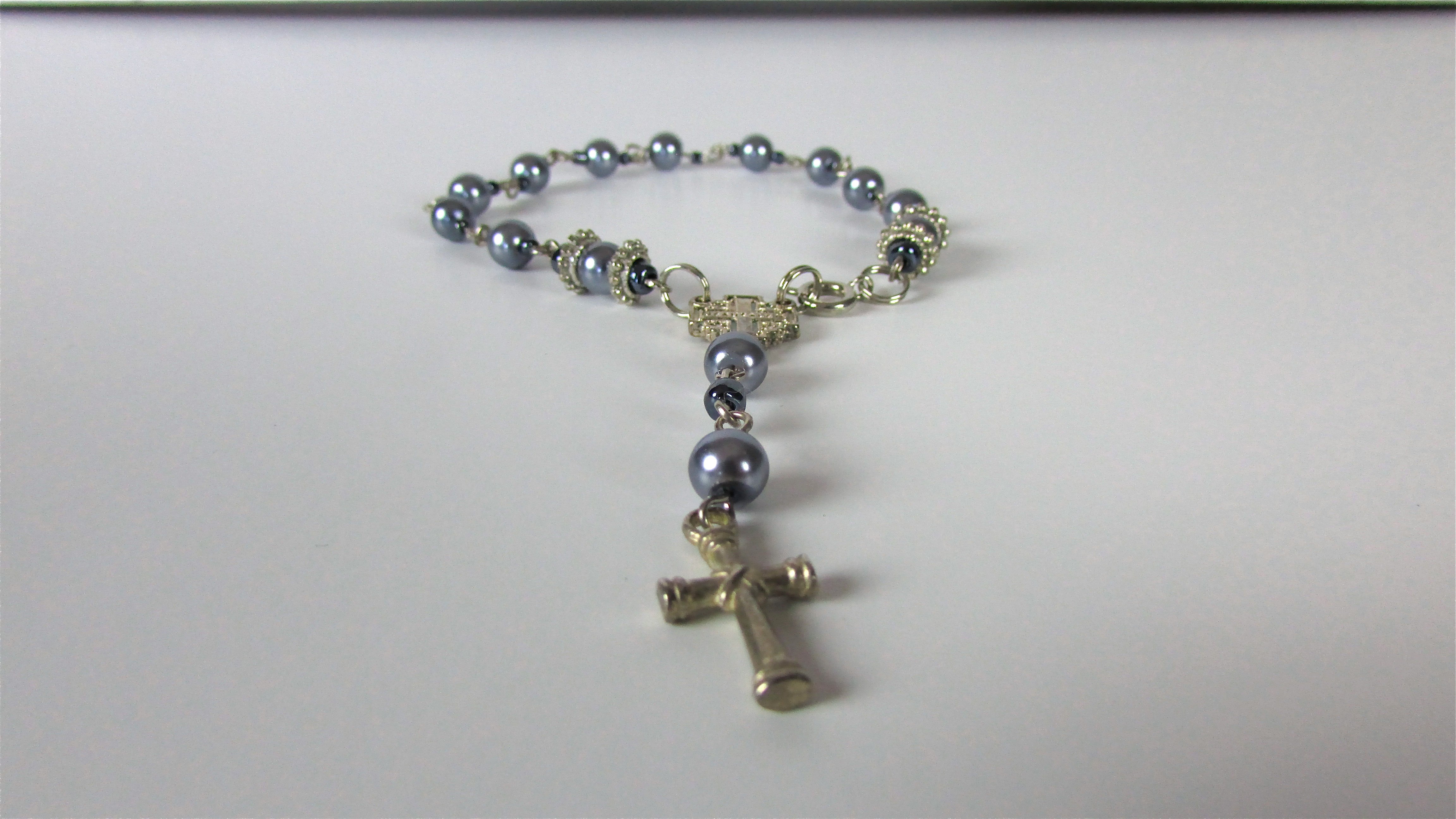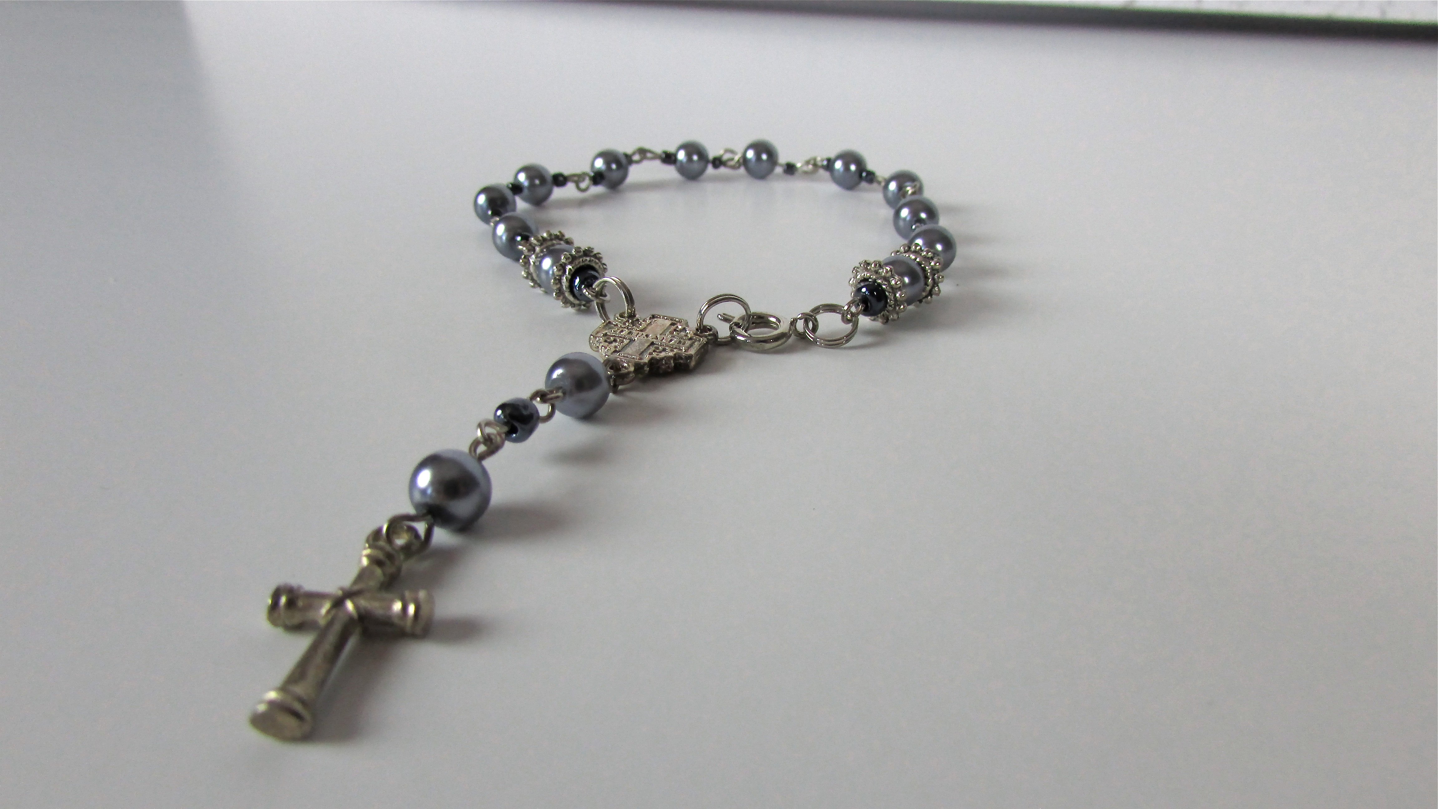 Handmade Rosary Bracelet made from faux purple pearls with silver detailing