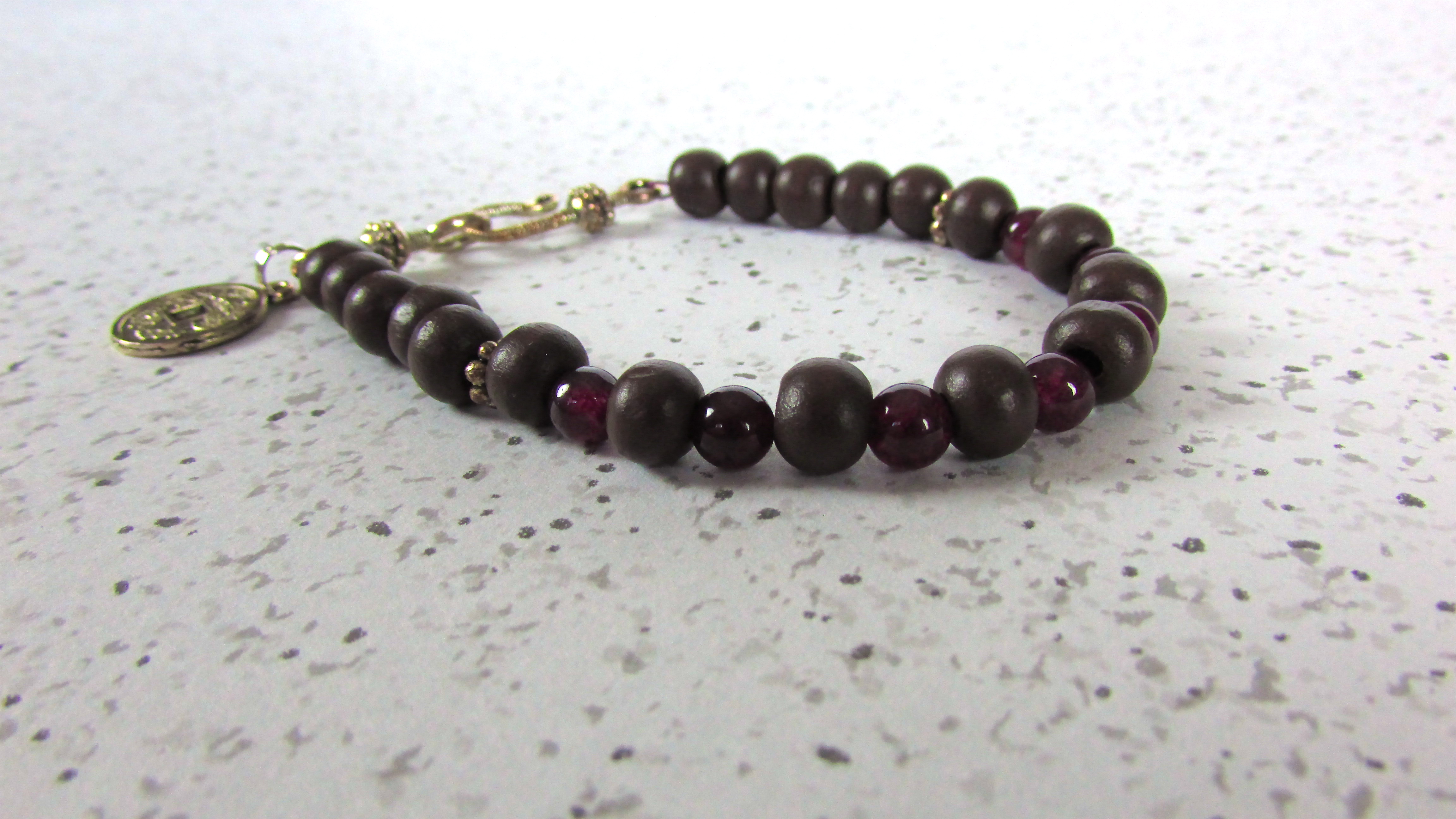 Handmade bracelet. Purple Quartz and dark wood beads with a small coin charm and a hook clasp. Purple Quartz for you third eye Chakra.