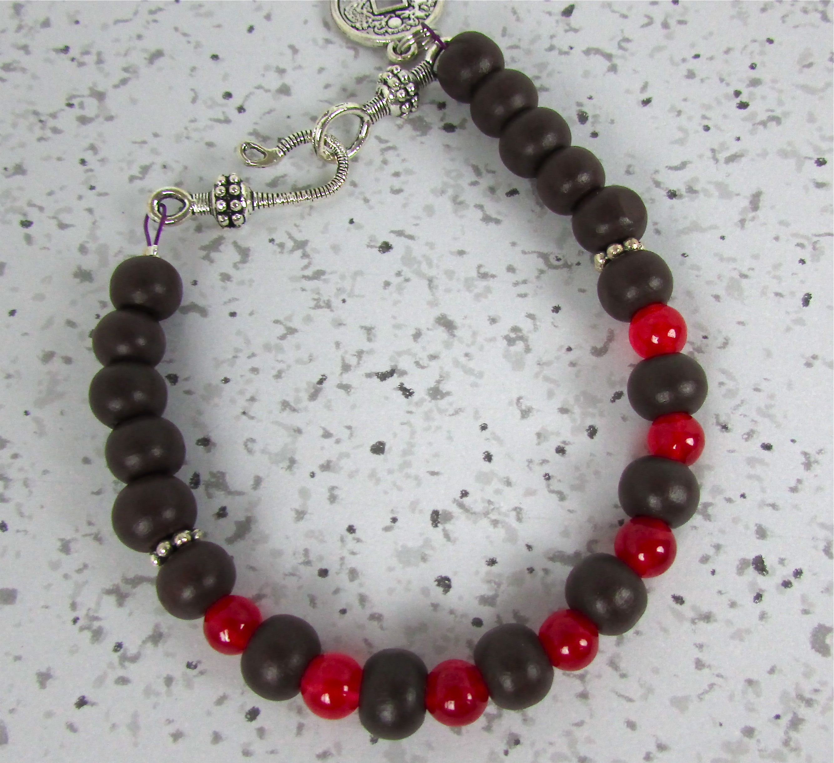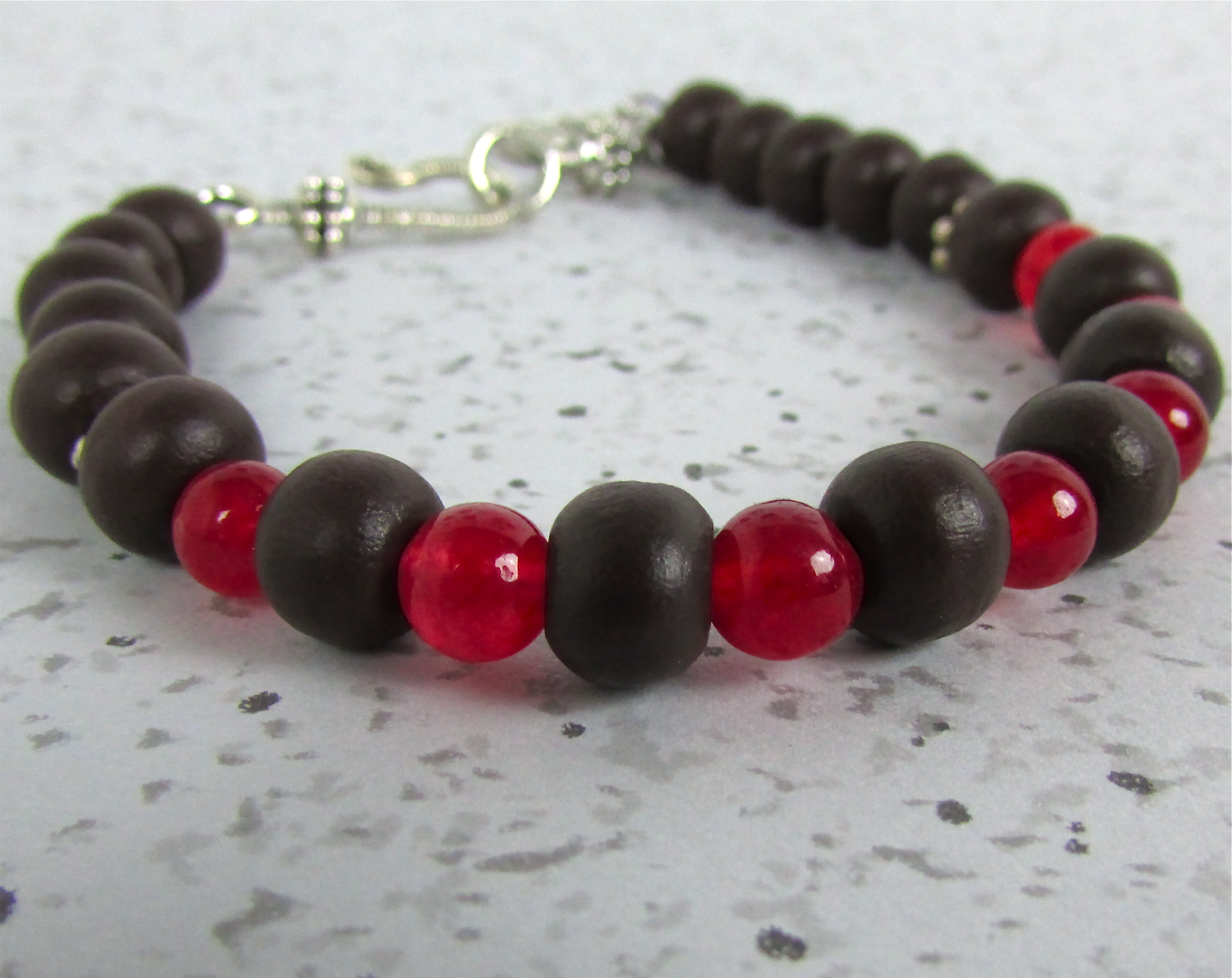 Handmade bracelet. Red Quartz with dark wood beads, a small coin charm and hook clasp. Red Quartz for your root Chakra.