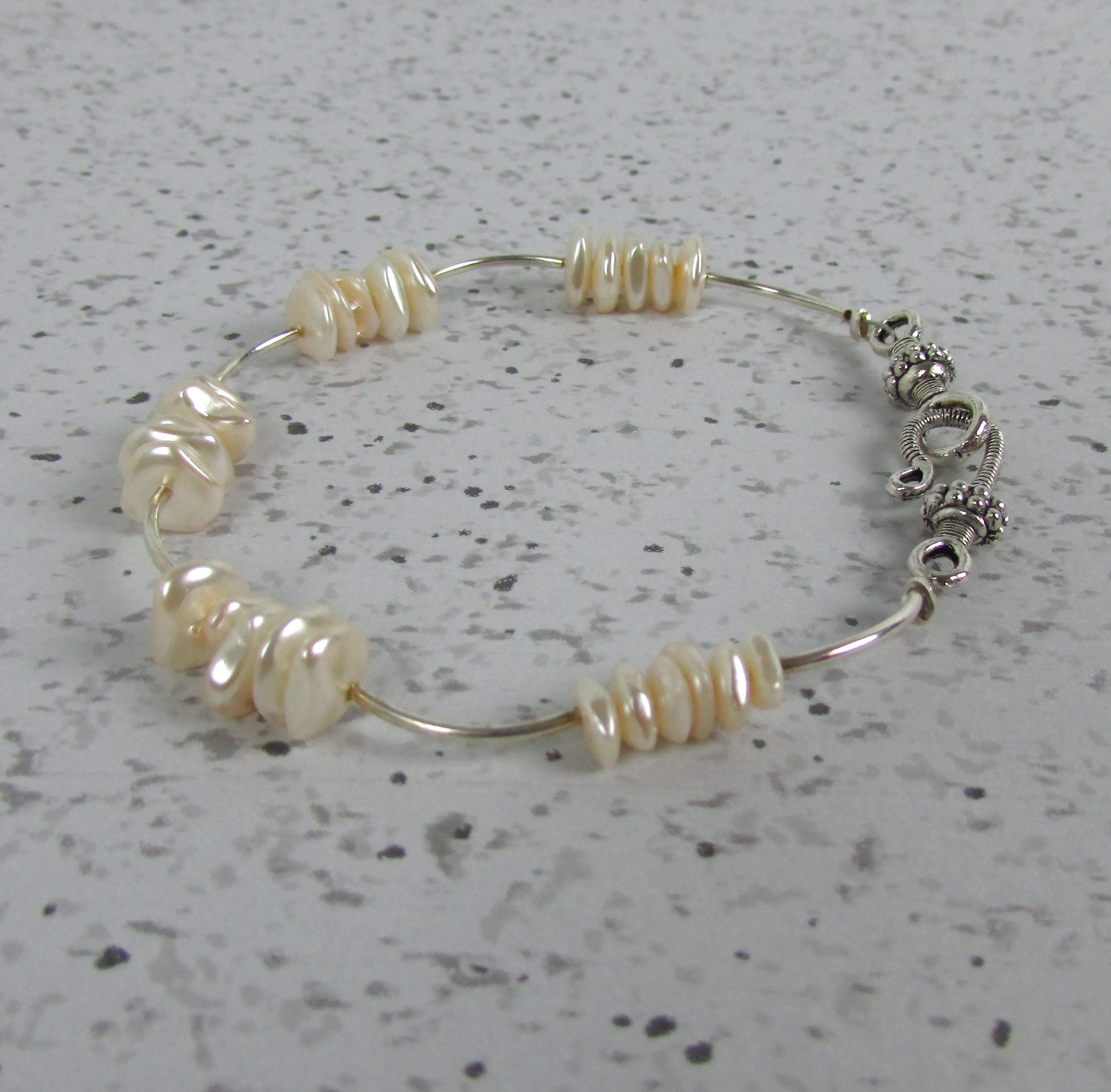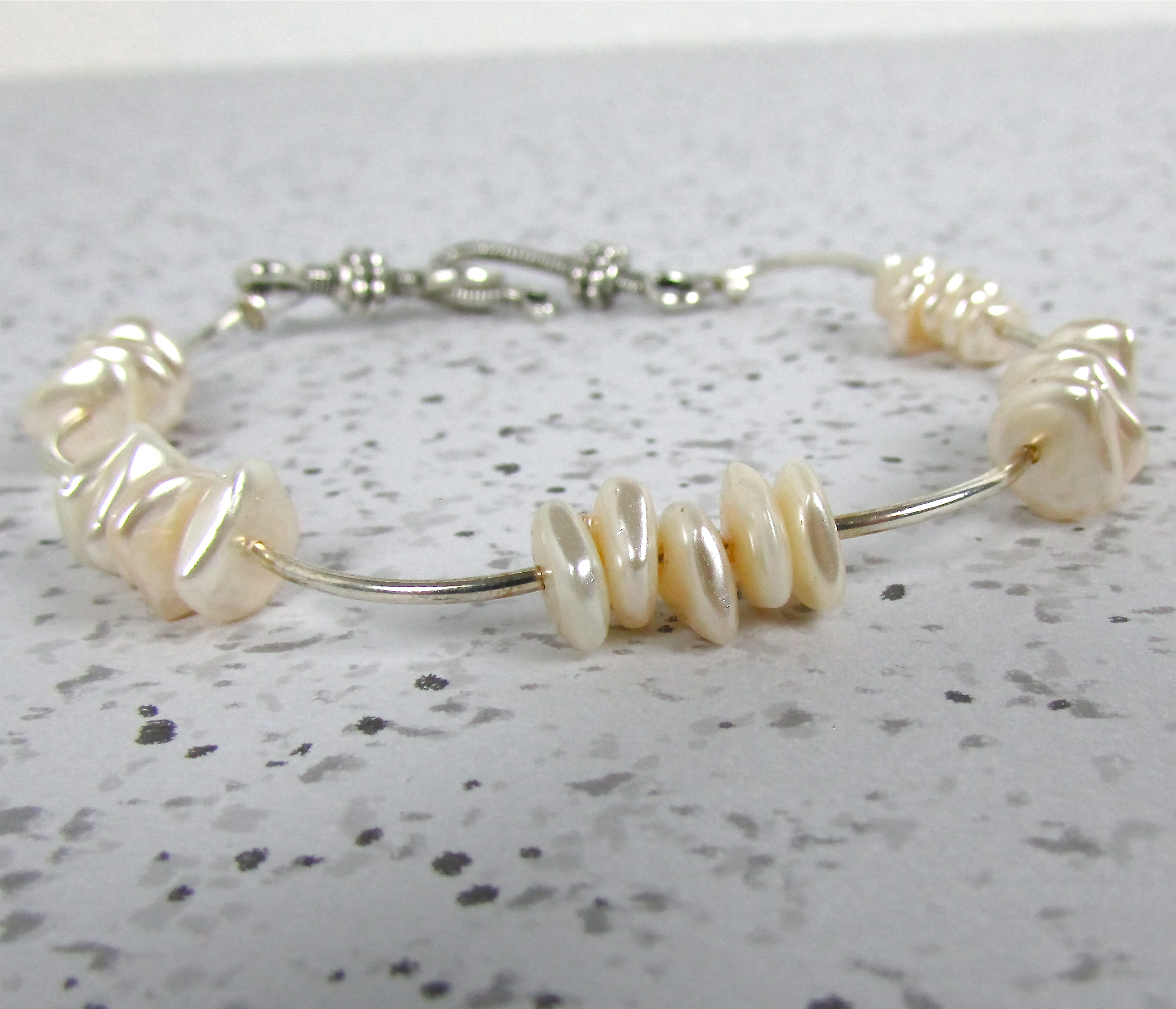 Handmade Bracelet. Real fresh water flat pearls with silver detailing and a hook clasp.