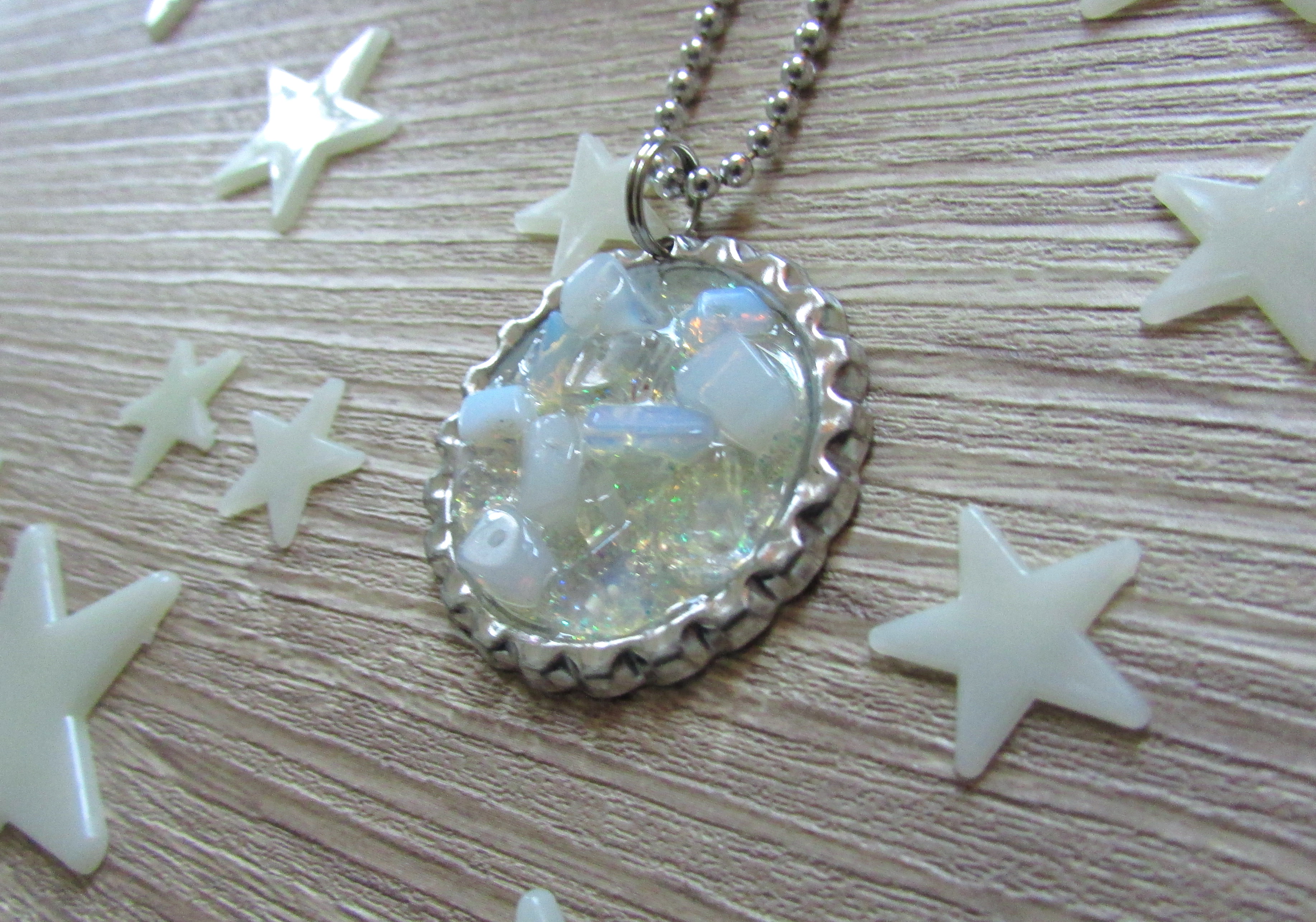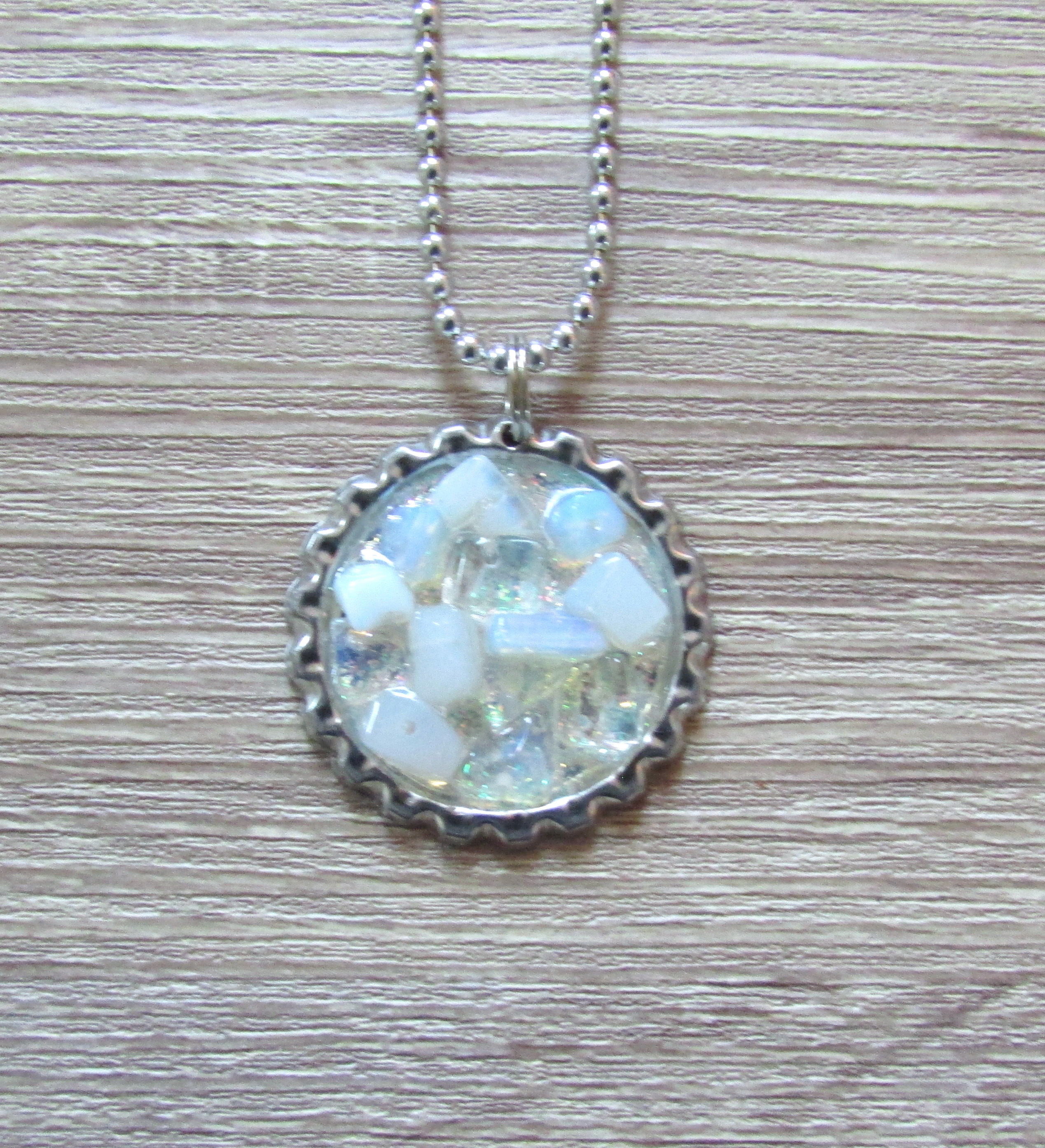 Moonstone fragments resin cast into a bottle cap on a 14 inch ball chain necklace